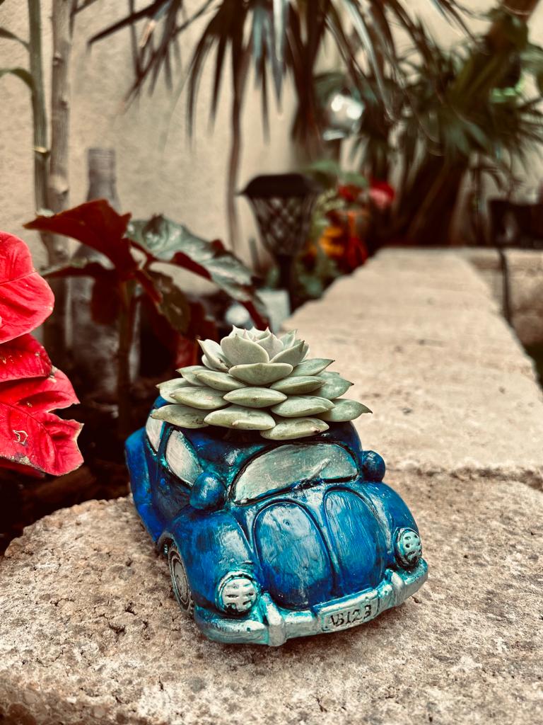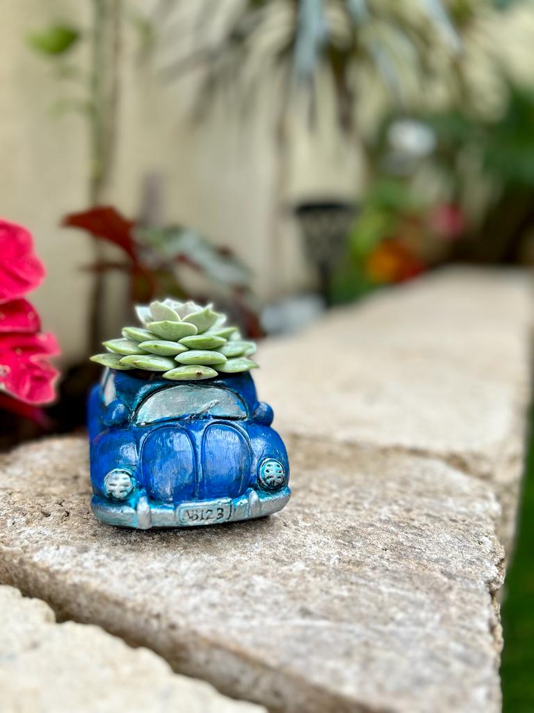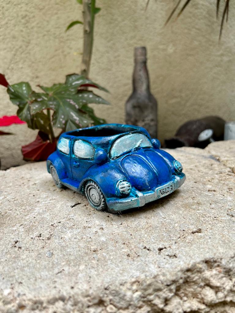 עציץ מבטון בצורת מכונית "חיפושית" לסוקולנטים, בצבע כחול