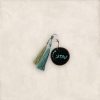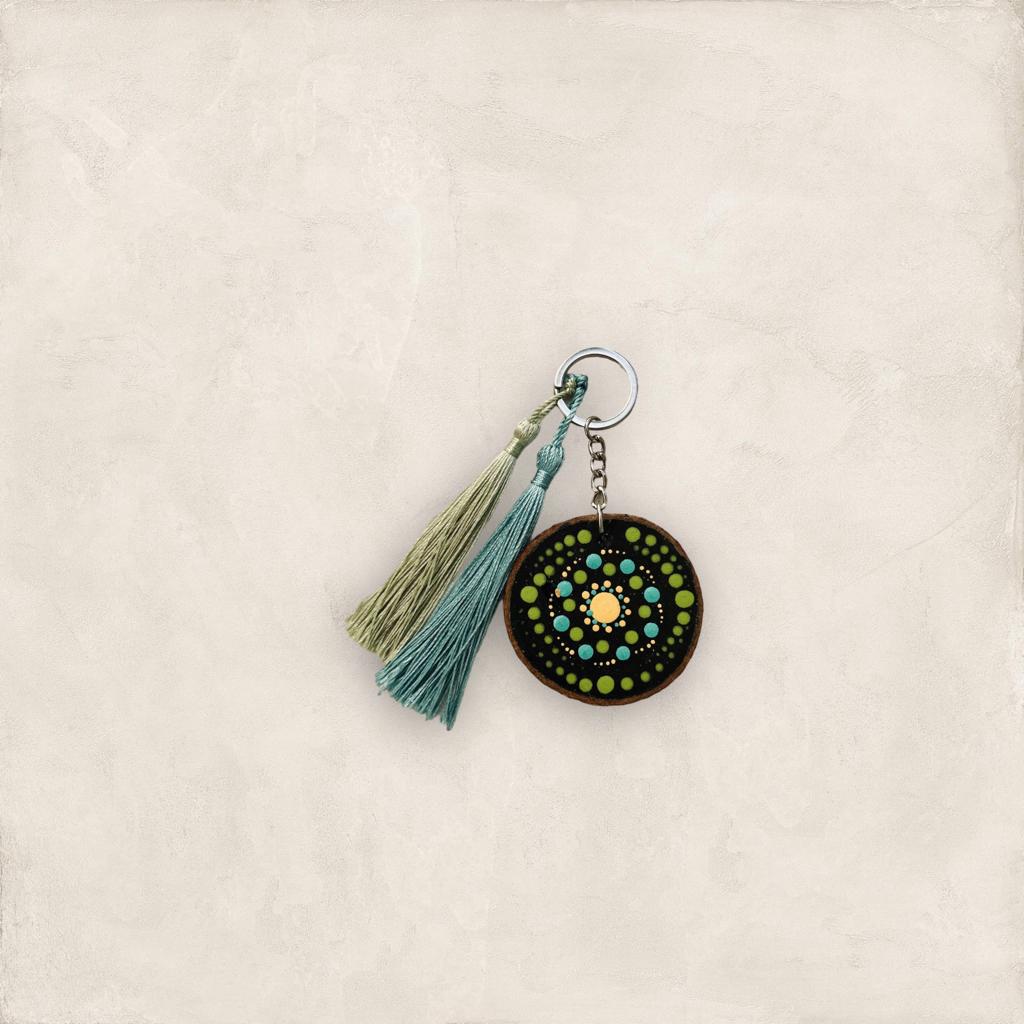 מחזיק מפתחות עגול בגווני שחור, טורקיז, ירוק וצהוב ושני גדילים ירוק וטורקיז