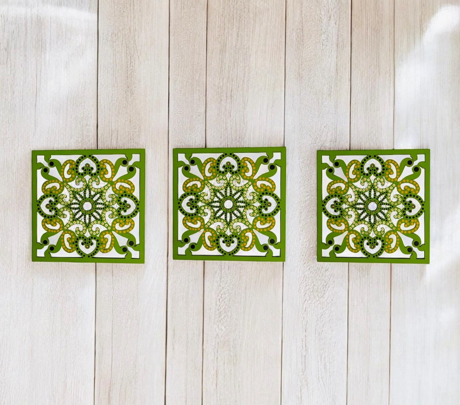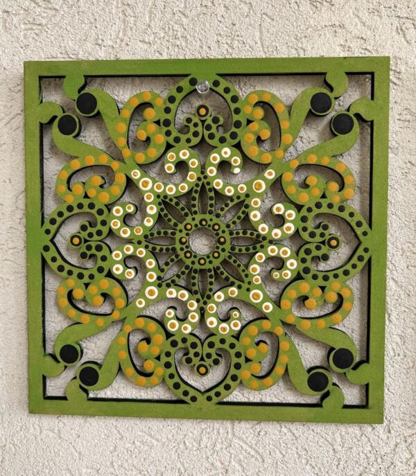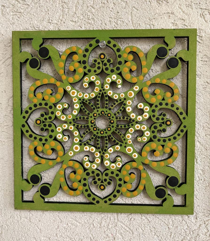 מנדלה נקודות על משרבייה מרובעת מעץ מצויירת באקריל